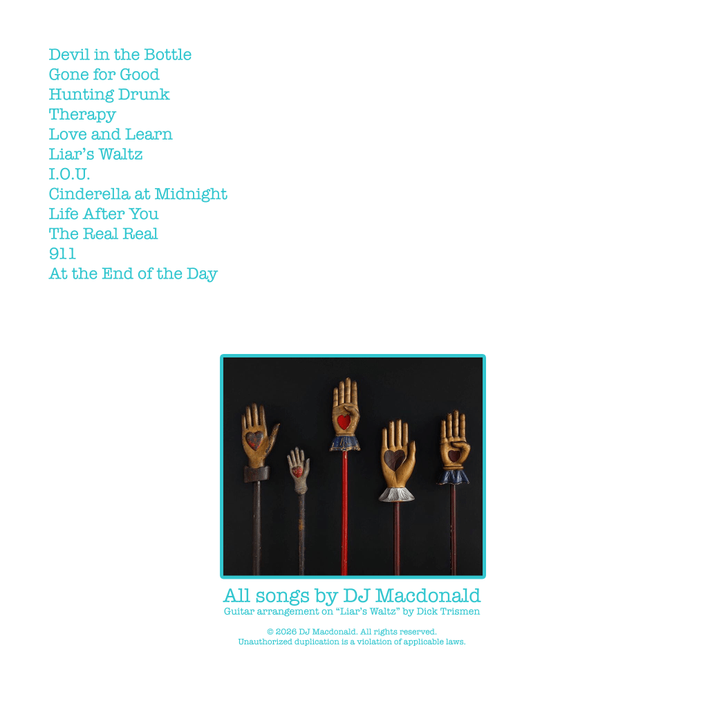 Therapy contains 12 songs in the C&W and folk vein, although we push the limits of that definition a bit, with, for example, the country punk rock anthem, “911,” an old Box 13 song recorded for, but left off of, the Death and Texas album back in 2004, and the country hip hop experiment, “The Real Real.” The album also contains a new version of Box 13’s folk ballad, “At the End of the Day.”